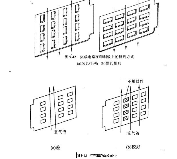 (1)對于采(cai)用自由對(dui)流空氣冷(leng)卻方式的(de)設備,最好(hao)是将👣集成(cheng)電🚩路(或其(qi)他元器件(jian))安縱長方(fang)式排列,如(ru)圖9.42 (a)所示;對(dui)于采用強(qiang)制空氣冷(leng)卻(如用風(feng)扇冷卻)的(de)設♍備,則應(ying)🥵按橫長方(fang)式配✏️置,如(ru)圖🔞9.42 (b)所示。