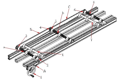 調整(zheng)調幅(fu)手輪(lun)1、經鏈(lian)條A帶(dai)動從(cong)動輪(lun)2轉動(dong),因從(cong)動輪(lun)2、3固定(ding)在同(tong)一調(diao)節螺(luo)紋軸(zhou)a上,從(cong)而從(cong)動輪(lun)3轉動(dong),經鏈(lian)條B再(zai)帶動(dong)💃從動(dong)輪4、5同(tong)時轉(zhuan)💁動,再(zai)經鏈(lian)條C帶(dai)動從(cong)動輪(lun)6轉動(dong),因從(cong)動輪(lun)2、3、4、5、6大小(xiao)一樣(yang),故整(zheng)個傳(chuan)動過(guo)程是(shi)同步(bu)進行(hang)的,也(ye)就是(shi)說,在(zai)🔞整個(ge)調幅(fu)過程(cheng)中,調(diao)🔞節螺(luo)紋軸(zhou)a.b.c同步(bu)轉動(dong),從⛱️而(er)驅動(dong)可移(yi)🎯動導(dao)軌在(zai)導向(xiang)支撐(cheng)軸X、Y上(shang)等距(ju)離移(yi)動,當(dang)然,此(ci)時傘(san)形齒(chi)輪同(tong)時也(ye)在棱(leng)軸上(shang)滑動(dong),從而(er)順利(li)完⭐成(cheng)調幅(fu)🙇♀️動作(zuo)。